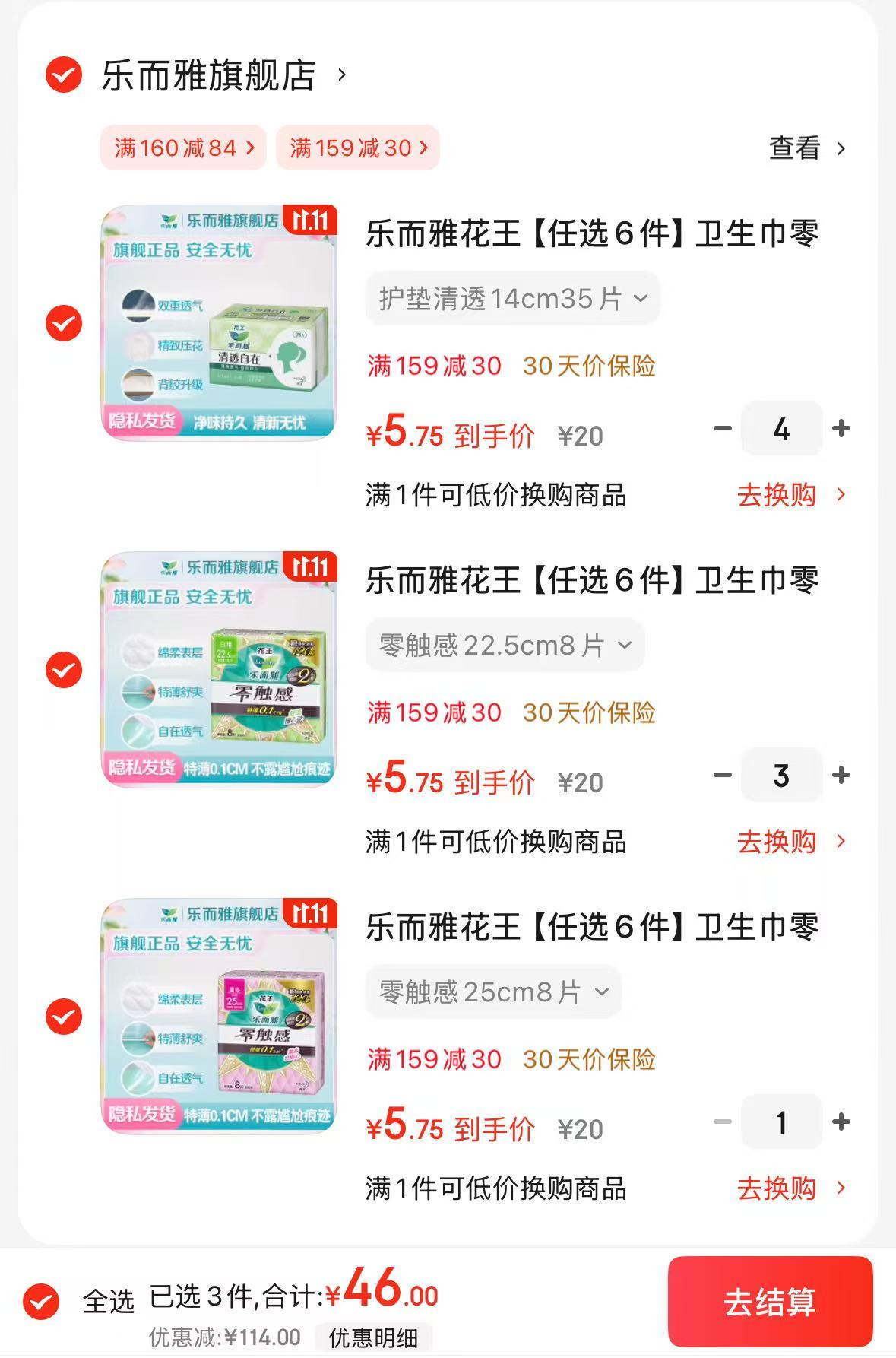 领159-30卷 花王 零触感卫生巾组合 任选46元 最低折0.1/片!