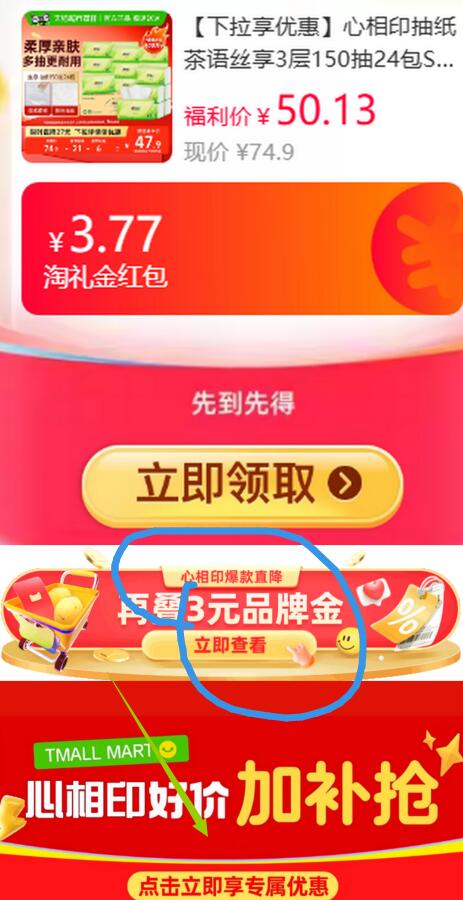 3.77礼金3品牌金38.69元 猫超包邮 详情页领3品牌金后再进超级补贴购买 心相印抽纸茶语丝享3层150抽24包S码