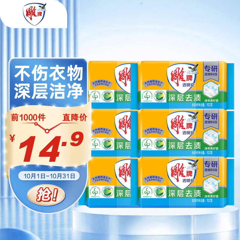 学生号5-1券 拍下11.9 雕牌 透明皂 净爽青柠香 102g*6块