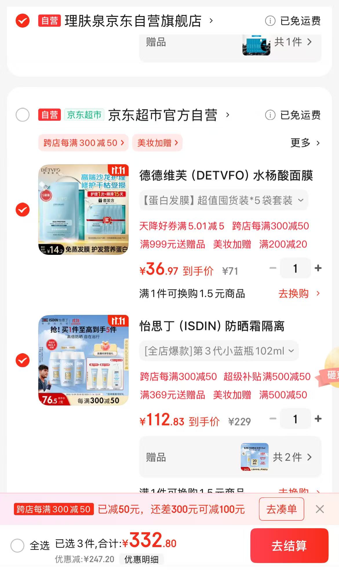 plus先领500-50劵 再领2张劵 ① ② 自营怡思丁 防晒霜隔离30ml*3