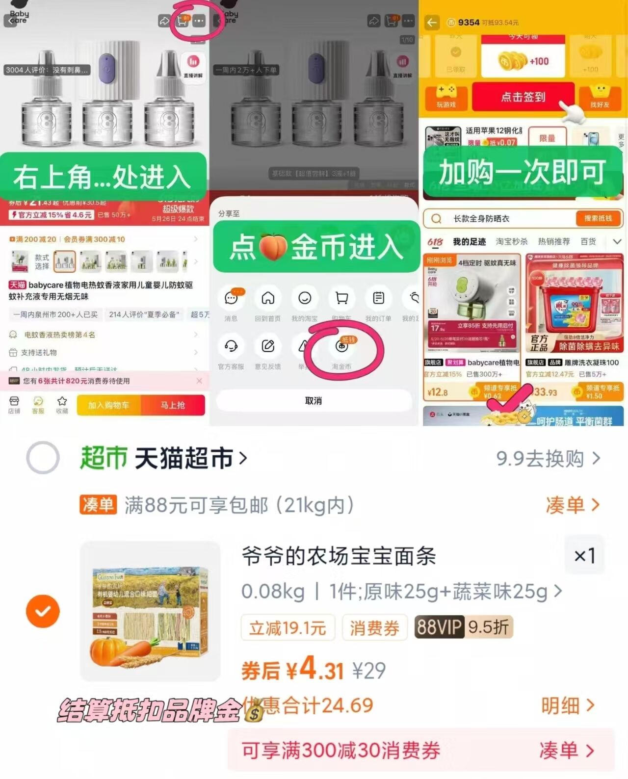 3爷爷的农场有机面条50g - 商品右上角3个点 选淘金币 再选 我的足迹-找到商品拍下