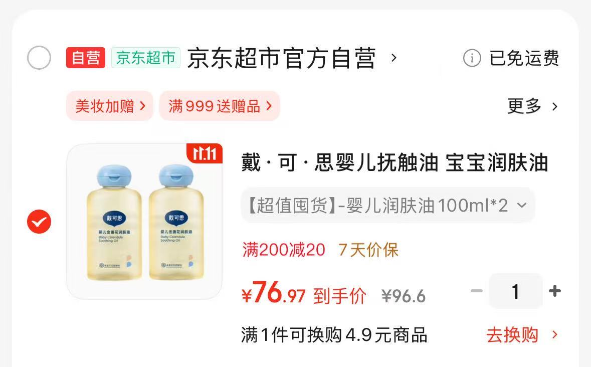 先跳APP领200-20卷https://u.jd.com/BrbqvMd再领78-10补贴卷https://coupon.m.jd.com/coupons/show.action?key=c7m6c9s9o2a749b79c6e7f7f3b327ee6&roleId=1449439501自营戴可思 婴儿抚触油100ml*2拍 https://u.jd.com/B1bPJLA凑 https://u.jd.com/B1byCza凑后76.97元 折38.4/支