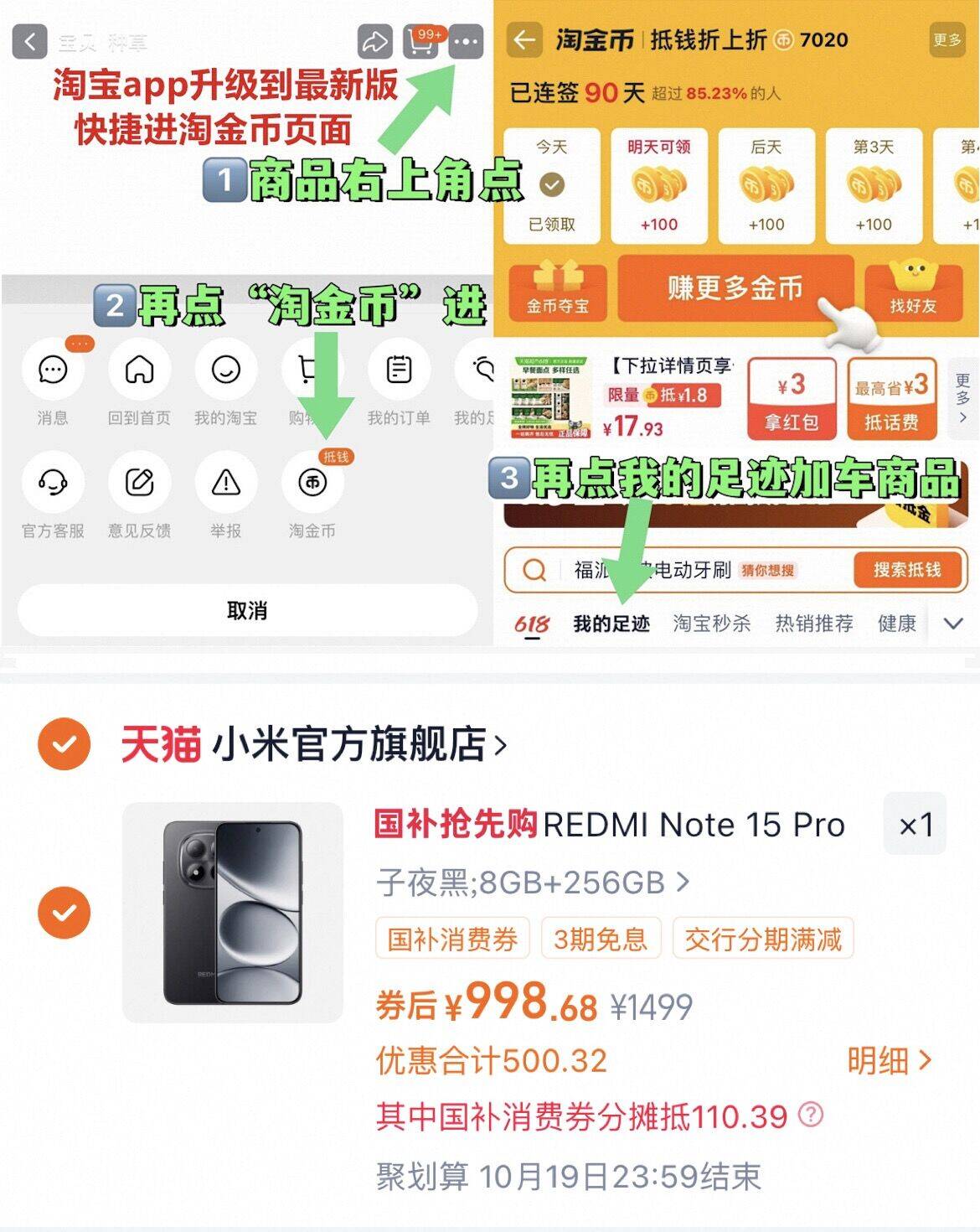 998元 详情页领1500-150卷 右上角进“淘金币”加 REDMI Note