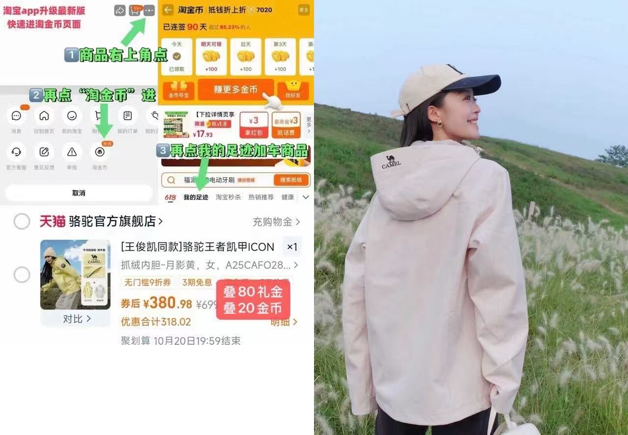 1骆驼王者凯甲冲锋衣380.9 - 1.复制打开淘宝 先把礼金拿了 2.商品右上角3个点